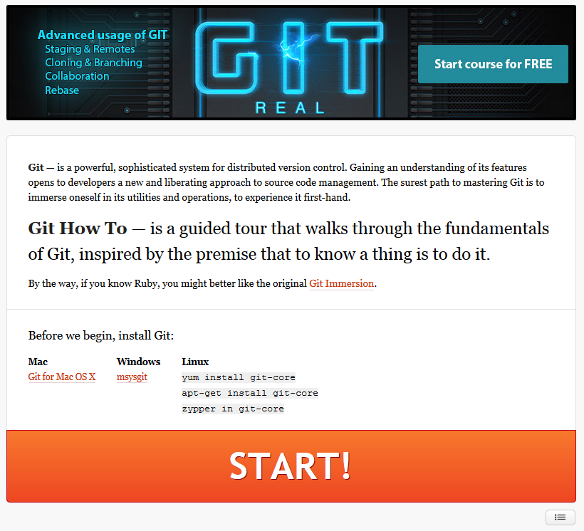 Git - інтерактивне навчання Nov 27, 2014 LearnGitBranching! LearnGitBranching Atlassian Git Tutorials Tutorials from atlassian codeschool - git Codeschool GITHOWTO - Git REAL Git How To Git - Book Pro Git book, written by Scott Chacon and Ben Straub