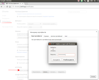 Тепер при налаштуваннях сертифікатів у бразуері Chrome, буде запити на пароль токену: