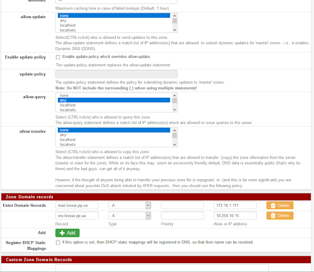 Стала необхідність створити резервні - Secondary DNS zones інших DNS серверів котрі працюють у віртуальному середовищі. У випадку коли проводяться операції з віртуальним середовищами до DNS сервери не відповідають. Реалізував secondary DNS zones за допомогою BIND DNS server у pfSense.