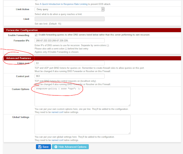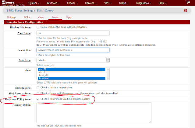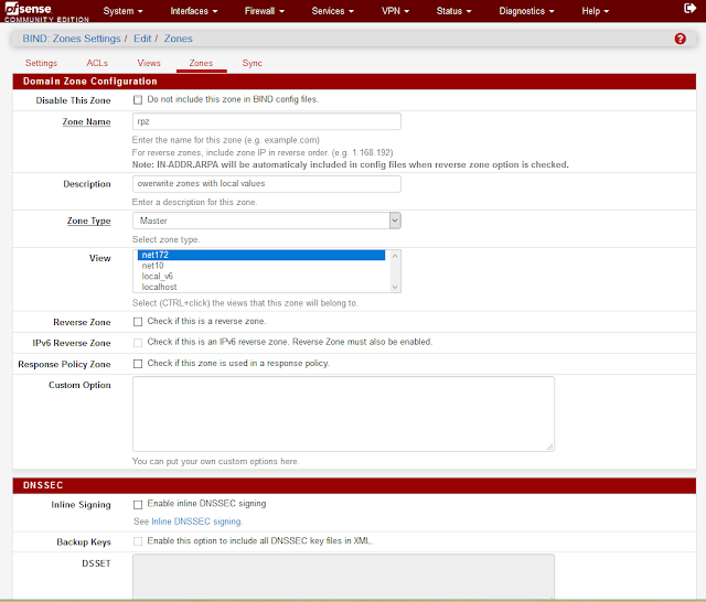 Розширенні налаштування BIND DNS сервера, в custom options визначаємо response-policy {zone “rpz”;};.