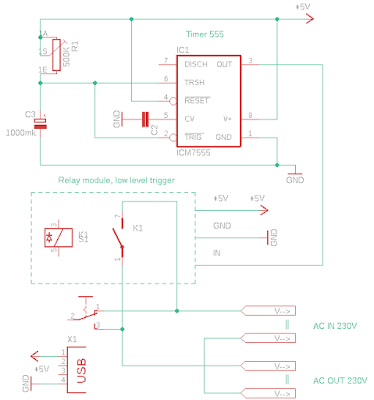 Тому вирішив це питання додавання таймера затримки вмикання реле на базі відомої і дешевої мікросхеми 555. Схема розроблена з урахуванням того що блок реле вмикається низьким рівнем сигналу IN.
