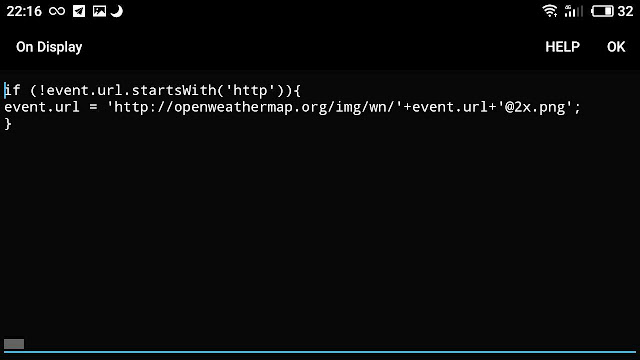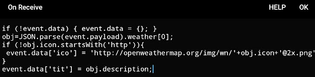 "jsOnReceive": "if (!event.data) { event.data = {}; } \nobj=JSON.parse(event.payload).weather[0];\nif (!obj.icon.startsWith('http')){\n event.data['ico'] = 'http://openweathermap.org/img/wn/'+obj.icon+'@2x.png';\n}\nevent.data['tit'] = obj.description;",