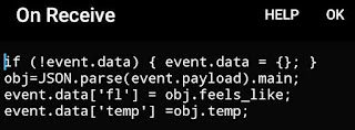 "jsOnReceive": "if (!event.data) { event.data = {}; } \n \nobj=JSON.parse(event.payload).main;\nevent.data['fl'] = obj.feels_like;\nevent.data['temp'] =obj.temp;\nd=new Date();\nm=d.getMinutes();\nh=d.getHours();\nr=(h==4 && m==10);\n\nif (r || !event.data['tmax']) \n event.data['tmax'] = obj.temp;\nif (r || !event.data['tmin']) \n event.data['tmin'] = obj.temp;\nif (event.data['temp']>event.data['tmax'] )\n event.data['tmax']=event.data['temp'];\nif (event.data['temp']= 11",