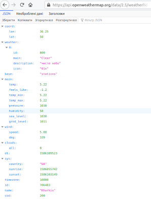 Візуальний результат у форматі JSON з OpenWeather