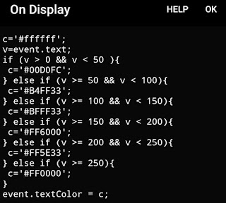 "jsOnDisplay": "event.text=event.data['z']+\"\\n\"\n+event.data['r'];\n\nc='#ffffff';\nv=event.data['z'];\nif (v > 0 && v < 50 ){\n c='#00D0FC';\n} else if (v >= 50 && v < 100){\n c='#B4FF33';\n} else if (v >= 100 && v < 150){\n c='#BFFF33';\n} else if (v >= 150 && v < 200){\n c='#FF6000';\n} else if (v >= 200 && v < 250){\n c='#FF5E33';\n} else if (v >= 250){\n c='#FF0000';\n}\n\n\n\nevent.textColor = c;",