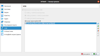 USB порт додано до віртуальної системи за матеріалами https://help.ubuntu.com/community/VirtualBox/USB