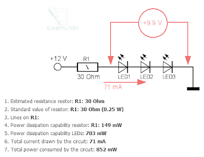72 світлодіоди споживають 1.32А. 72/3=24 паралельних групи. В групі 3 послідовних світлодіоди. Одна група споживає 1.32А/24=55 мА.
