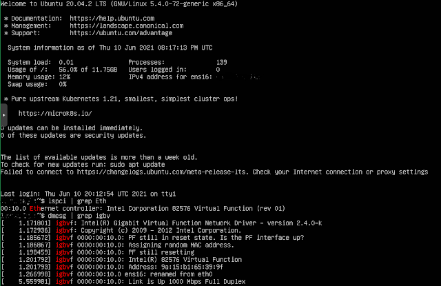 За тих самих налаштувань для VM в Ubuntu 82576 Virtual Adapter успішно отримав MAC адресу і назначив IP адресу.