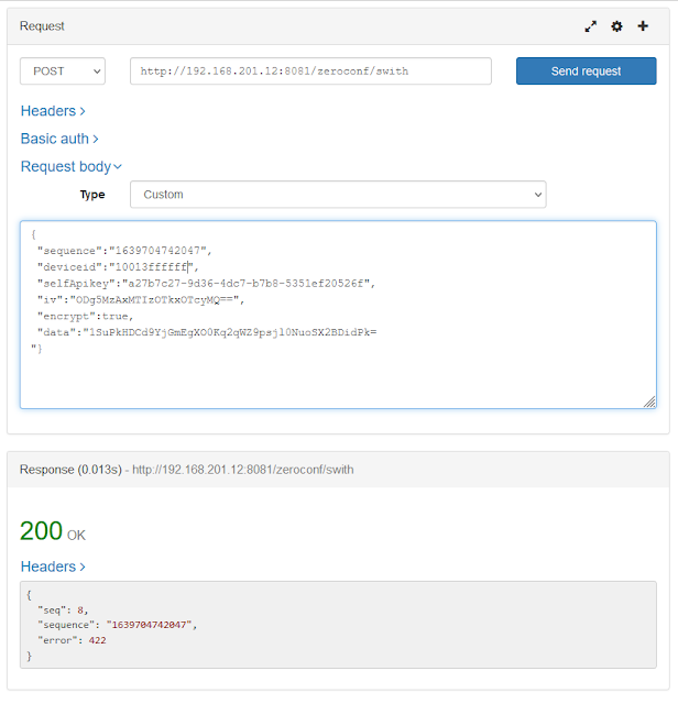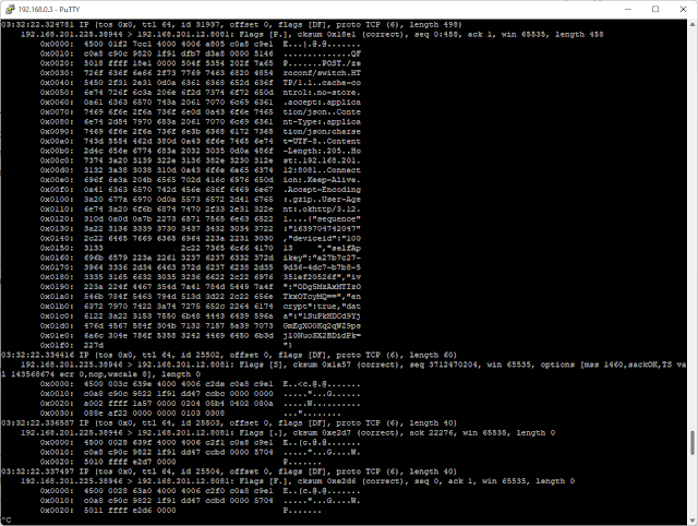 Нотатка : Sonoff S26R2 LAN mode dump Dec 15, 2021 RUN eWelink app in LAN mode swicth on/off device from app 1. tcpdump -nvX -i wlan0-1 -n host 192.168.201.12 and dst port 8081 and not port 5353 REST-API
