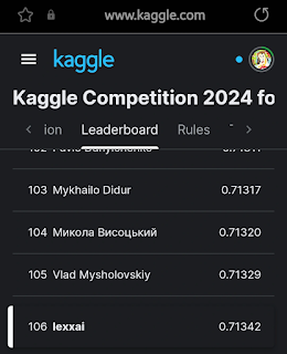 На сьогодні (за 4 доби до фінішу) 🔝зайняв 62 місце (піднявся з 87), і напевно вже вище не зможу стати, а тільки нище 😃. Але відновив деякі знання використовуючи записи з домашніх завдань курсів Data science в GoIT - start your career in IT : https://github.com/lexxai/goit_python_data_sciense_homework .