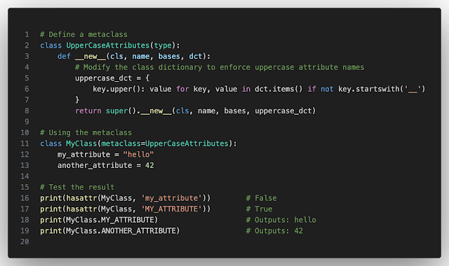 - Метаклас UpperCaseAttributes: Приймає ім’я класу, його базові класи та словник атрибутів. Він створює змінений словник з атрибутами у верхньому регістрі, після чого передає його в type __new__.