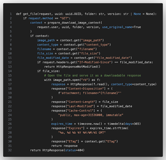 🚰 Якщо потрібно віддавати певні файли засобами Django view, а не як статичний файл через NGINX. То не забуваємо додавати заголовки про інформацію для кешування браузерами, щоб не перевантажувати запитами сервер.