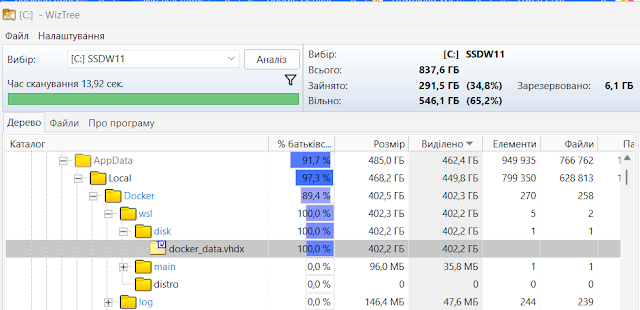Реальний розмір віртуального тому завжди більший за фактичні дані. Це відбувається тому, що .vhdx‑файл у WSL та Docker може лише збільшуватися у міру потреби.